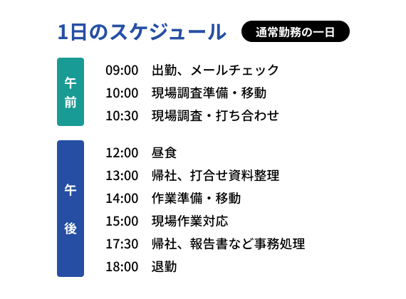 | 就業時間 | 9:00~18:00(実働8時間) * 現場により夜間対応あり * 夜勤がある場合は「明け休み」または「遅出出勤」で調整 * 年間稼働のうち 約3分の2が日勤・約3分の1が夜勤 |