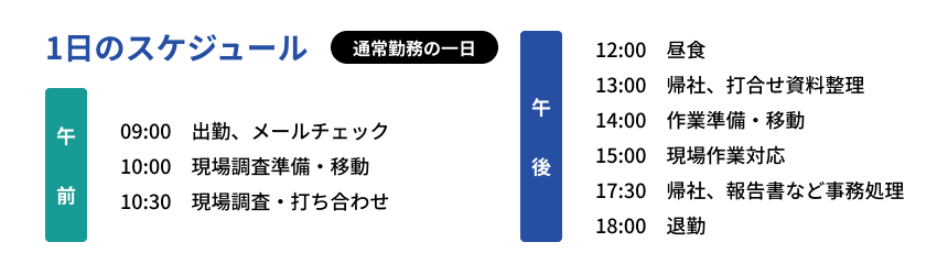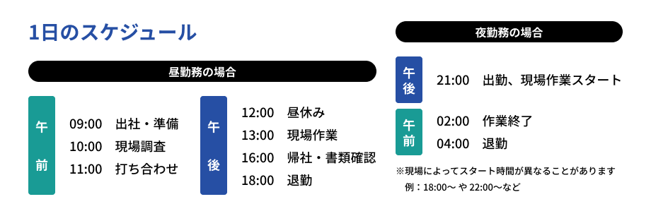 | 就業時間 | 9:00~18:00(実働8時間) * 現場により夜間対応あり * 夜勤がある場合は「明け休み」または「遅出出勤」で調整 * 年間稼働のうち 約3分の2が日勤・約3分の1が夜勤 |